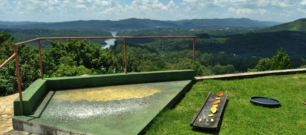 Ao lado do platô das quirelas, mantenho sobre a grama uma tábua de madeira onde também toda manhã coloco banana, mamão e laranja. Quando tenho, disponibilizo outras frutas também, como abacate e manga. Seus consumidores são os vários sanhaços, cinza, coqueiro e amarelo, sabiás-do-campo, sabiás-laranjeira, sabiás-poca, bem-te-vis, saí-azul, as várias saíras, como a sete-cores, dentre outros menos comuns.